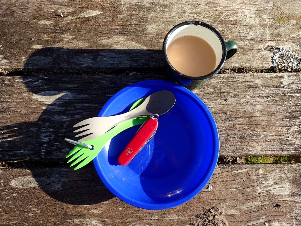 A camping staple that can be purchased very cheaply from most outdoor shops, a shallow plastic bowl can be stacked neatly with your stove and is perfect for serving anything from porridge to pasta. A simple tin mug is also great for hot drinks to keep away the chill during cold nights in the outdoors. I enjoy making Cup a Soup in my mug as a starter while waiting for the main course to cook, and of course cups of tea at every opportunity. A penknife is always a useful tool, for chopping ingredients and opening cans.