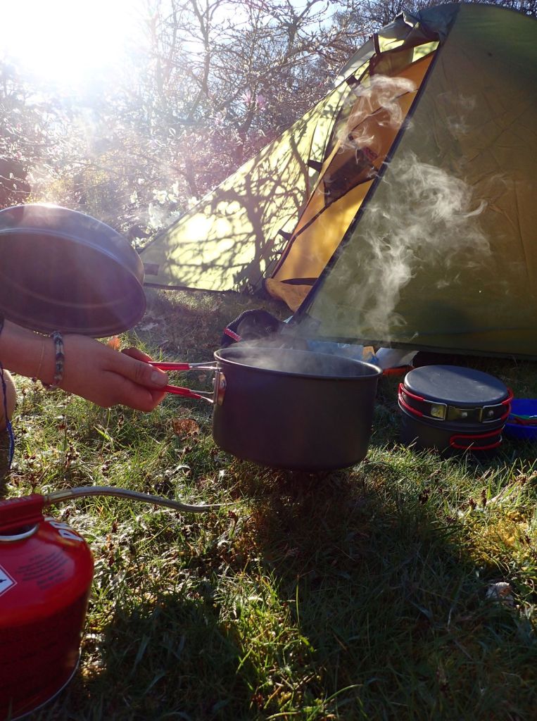 My stove and set of pans, purchased under expenses for a Geography field trip, are from the budget yet high-quality brand Alpkit, and are some of my most beloved bits of kit. The efficient gas burner heats up water extraordinarily fast, while the set of pans stack neatly inside each other with handles that fold away to fit the sides of the pan and create a compact set. The entire apparatus is quick to set up and compact enough to use inside the tent porch (with great care, of course) – a big bonus during foul or midgy weather, or if you just fancy a cuppa before getting out of bed.