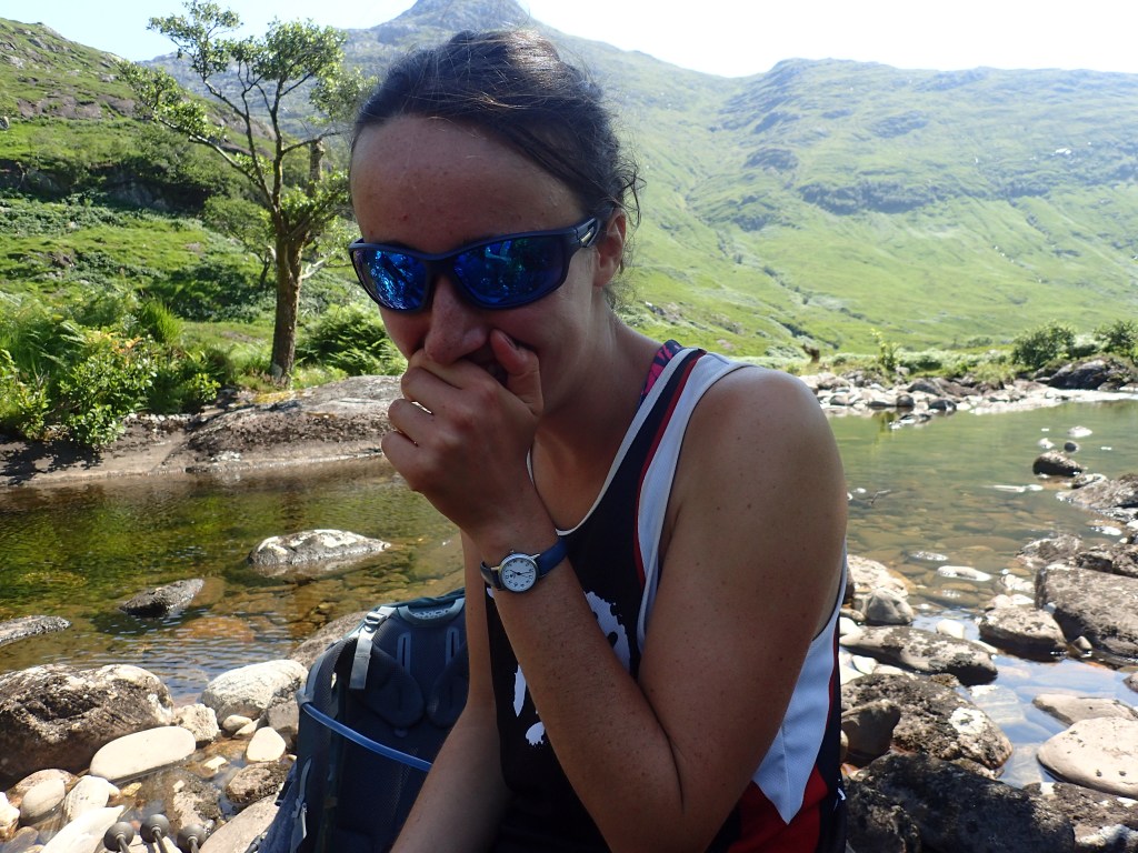The July heatwave hit on our second day as we climbed another pass out of Glen Finnan and dropped into neighbouring Glen Dessary. Although the weather was beautiful, the heat made progress extremely hard-going. Before long we were each getting through 4 litres of water per day. The sunshine also brought hordes of ‘clegs’ – aggressive biting horseflies which leave furiously itchy welts the size of satsumas.