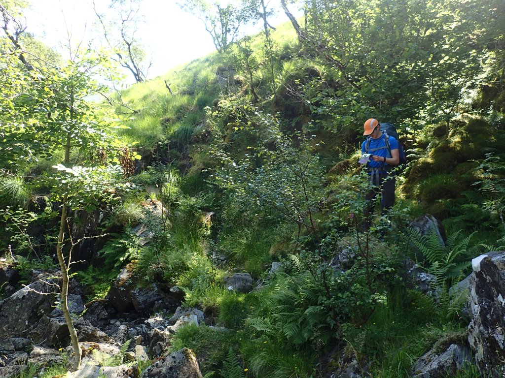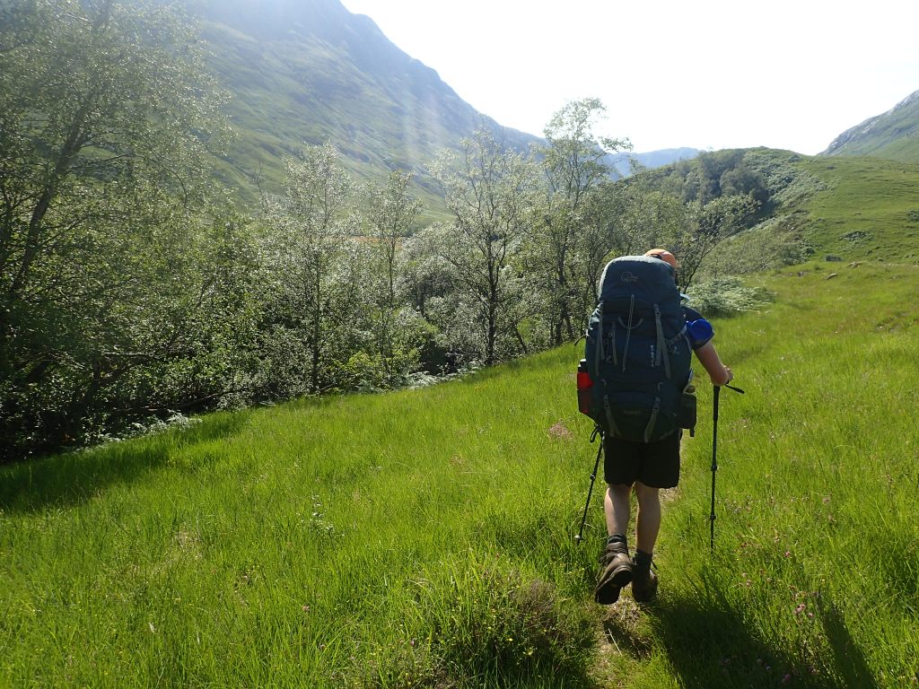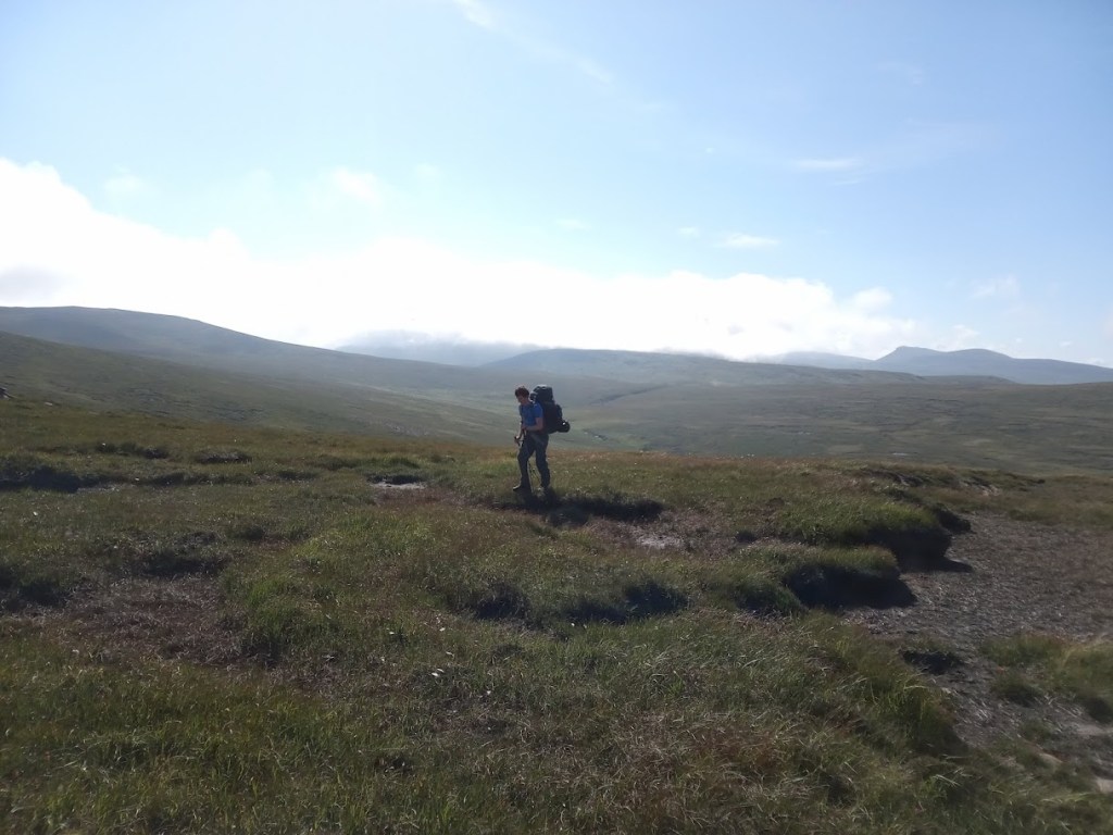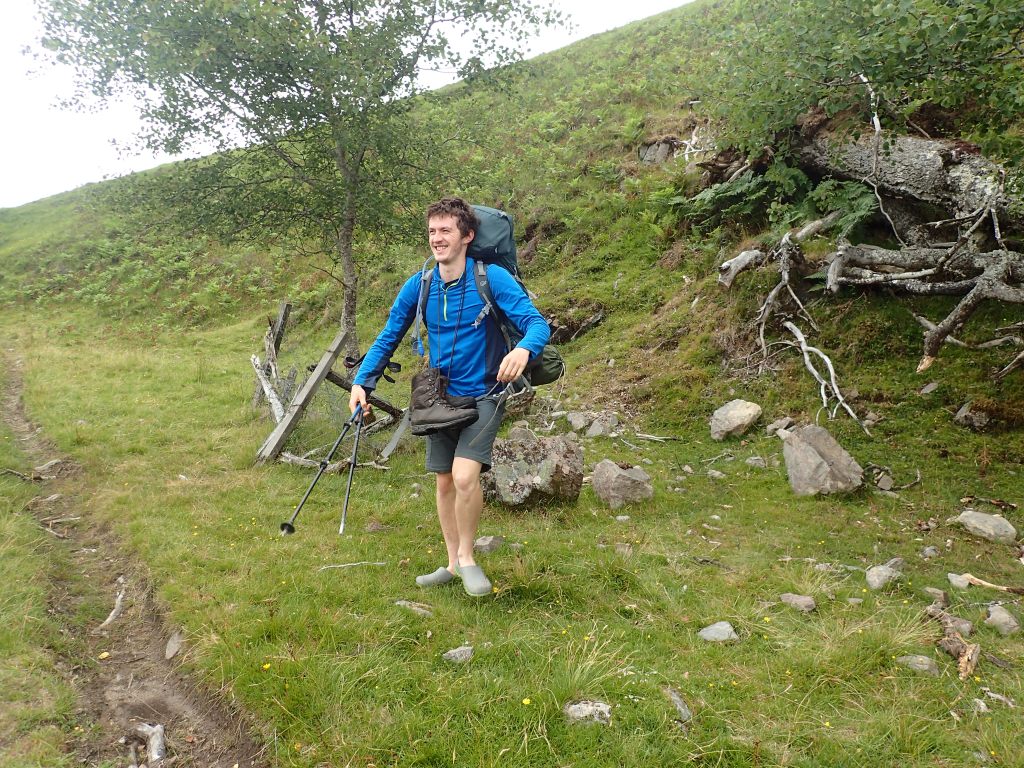The next day dawned even hotter than the last. Leaving Sourlies and Loch Nevis behind, we headed inland, into what is aptly named ‘the Rough Bounds of Knoydart’. It soon became apparent why this is the case. Up until this point our route had been blessed with some form of path. However, heading into the depths of the Knoydart peninsula, we soon found ourselves stumbling through tussock, bog and boulder, while the sun beat down relentlessly overhead. It was in this rough wilderness that we first brought out the first aid kit, after Chris slashed his knee on a sharp tree stump. A little further on, the end of Chris’s walking pole became detached and vanished inexplicably into a bog. After spending twenty minutes digging up the bog with our toilet trowel, we were forced to admit defeat and soldier on.