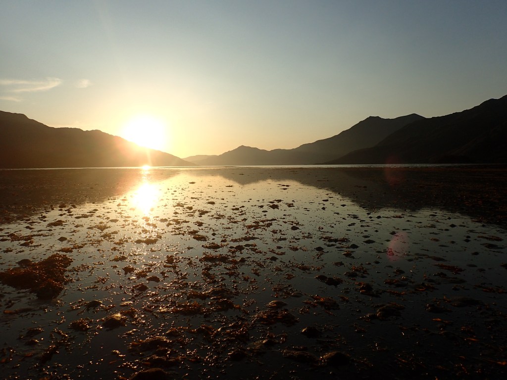 It was something of a relief, after a long and sweaty ascent, to climb over a pass and drop down into the next fjord-like glen as evening descended. Isolated from roads, the small settlement at Barisdale lies at the edge of another winding sea loch, Loch Hourn, and is serviced only by boat. After dropping our bags at the ‘bothy’, which miraculously had a real flush toilet, we set off for a cooling dip in the sea. The tide was low, leaving a vast expanse of seaweed and saltmarsh to cross before reaching the water’s edge. It was a perfect Highland summer evening: the air was still and the sea like a mirror as the sun sank into the horizon, flooding the bay with golden light. We waded towards the sunset through silken water that never reached higher than our knees; every shell on the seabed was crystal clear, as if looking through glass. Finally we stopped, and stood bathed in light, until dusk crept over the land.