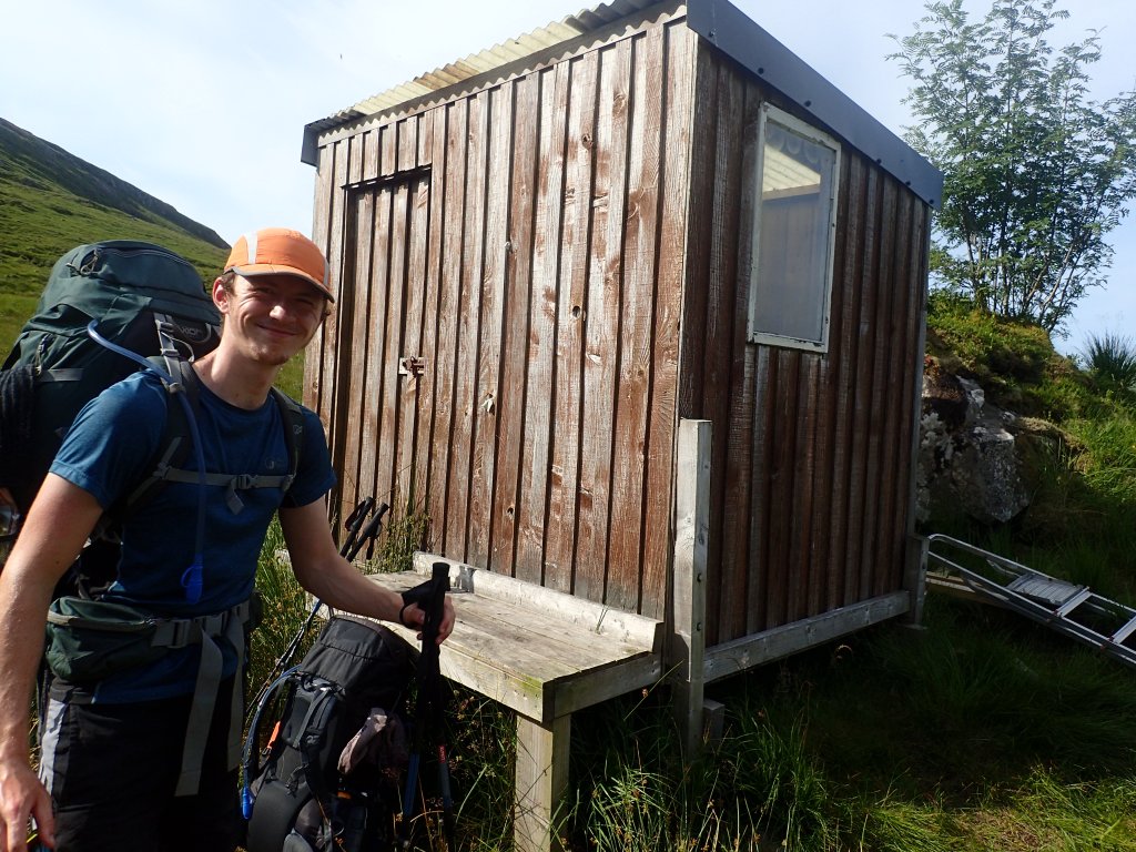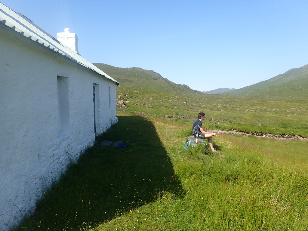 The next morning we awoke refreshed after a glorious night’s sleep, able to appreciate for the first time that we were already one third of the way through the trek. We devoured a delicious cooked breakfast prepared by our host, Adrian, who generously gave us a lift back along the road to the starting point of the next stage. The day’s route took us through searing heat to the Falls of Glomach (one of several waterfalls we encountered along the way which claimed to be the highest in Scotland) and up onto a high, boggy plateau that I can only describe as midge hell. Due to a relatively late start and long day, with 27km of distance and 900m of ascent, we didn’t reach the sanctuary of Maol Buidhe bothy until 9pm, by which point we were in a frenzy to escape the clouds of midges. The lone hillwalker who was already there tucked up in bed must have got quite a fright when we piled through the door with the desperation of those escaping from a burning building.