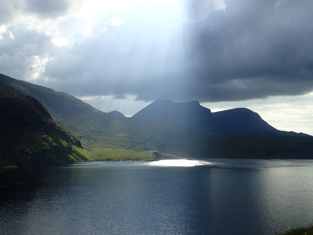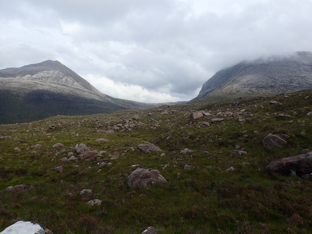 By this point, the unrelenting physical strain of the Trail was starting to take its toll. Chris had developed a muscular pain in his left shin, while I was concerned that I was developing stress fractures in my feet given the level of pain they were in. After seeking reassurance from Chris’s mother, a GP, we ploughed onwards, leaving Strathcarron and civilisation behind. Thankfully, a break in the weather was on its way at last, and the intense heat seemed to relent a little as we made our way up a glen towards the hallowed peaks of Torridon. I had heard so much about Beinn Eighe, Beinn Alligin, and Liathach that the famous summits had taken on an almost mythical status in my mind. However, nothing prepared me for the soaring drama of the vista that greeted us at the top of the pass. Gazing out towards the sweeping escarpments and jagged ridgelines of Torridon, I almost laughed out loud with joy.