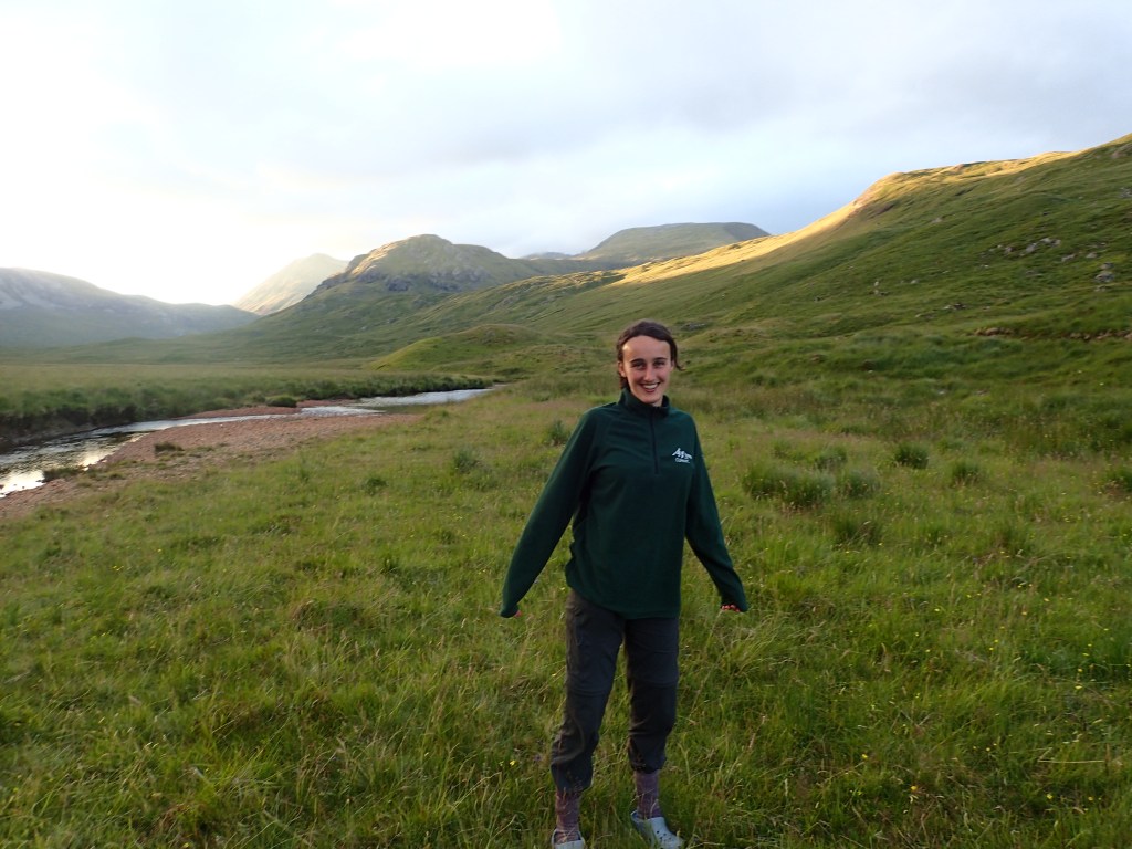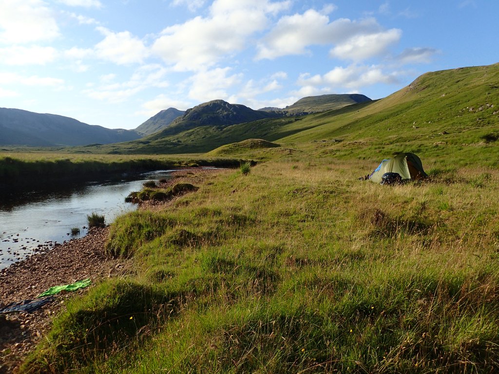 After a midgy night, we continued our journey, heading inland along the banks of Loch Hourn, which extends its long arm all the way to a small settlement at Kinloch Hourn – the first contact with a road in several days. En route, we met a kindly gentleman who provided us with some much-needed sustenance in the form of wine gums, and offered for us to leave our bag of rubbish under his car for him to take away when he returned. Upon reaching Kinloch Hourn, we identified his car (an unmistakeable champagne-coloured Jaguar) and deposited our rubbish, before rounding the end of the loch at last and ascending into the hills on the northern side. Feeling strong, we pushed on until we reached a tiny stalker’s hut on the banks of a shallow river high up in the Glen Shiel hills. As we had originally planned to camp at Kinloch Hourn, we were feeling smug, congratulating ourselves on biting off a chunk of tomorrow’s work despite the intense heat. So smug, in fact, that we cheerily decided that we could manage a detour from the main route in order to bag a Munro summit* tomorrow.