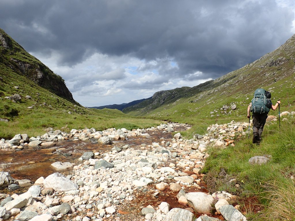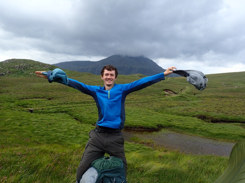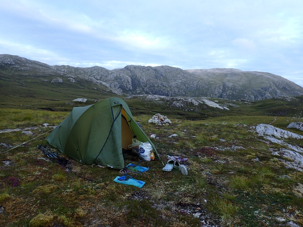 We quickly settled into a routine: start each day by slathering our skin with a disgusting mixture of suncream and insect repellent; walk for an hour; rest, eat and drink; repeat. By the end of each day we were so sticky and overheated that our first priority was to jump into the nearest body of water, be it loch, river or sea, to cool off. Our bottle of biodegradable ‘Wilderness Wash’ came into its own for scrubbing the sweat and grease from our skin, and washing the day’s socks and underwear so that it could dry off hanging from our packs the next day. After that, all remaining energy was devoted to cooking and devouring dinner, washing up in the nearest stream, and relaxing for a while before going to bed.