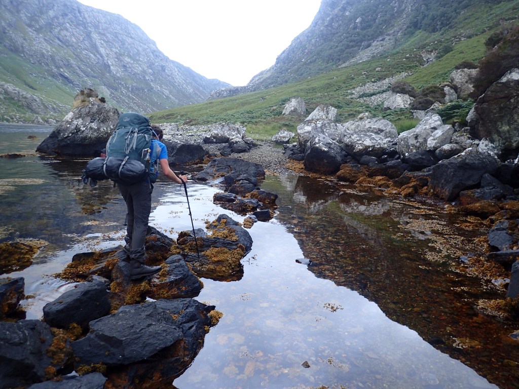 That night we stayed in the Ling Hut, a well-equipped bunkhouse that seemed palatial compared to the cramped quarters of our tent. By the following morning, the weather had definitely broken; the blue skies we’d become accustomed to were hidden in swirling grey cloud and the air was much cooler. It was a blessed relief to walk without being caked in suncream and insect repellent, as the cloudier weather had caused the clegs to disappear. Not only that, but the cooler climate had lent us a fresh burst of energy. Liberated from heatstroke and dehydration, we practically bounded up the foothills of Beinn Eighe, making a quicker pace than we’d managed on the entire Trail so far. By lunchtime we’d reached Lochan Coire Mhic Fhearchair, a beautiful lochan nestled in the bowl of the mountain, where I went for a spontaneous dip in its icy silver waters.