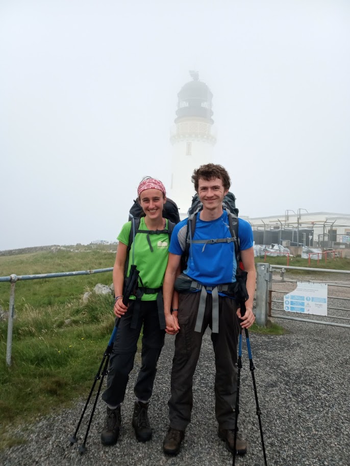 As we neared the Cape, the blue skies were covered by swirling fog. Our reluctance at ending the journey was replaced by excitement at reaching the legendary lighthouse that marks the most northwesterly point on the British mainland. And so we marched the final mile, hearts pounding with anticipation. All of a sudden, the outline of two gateposts loomed out of the mist, and as we strode up the drive towards the lighthouse, we were greeted by a wild clapping and cheering. The ultramarathon reception committee, glimpsing our figures through the fog, thought that we were another pair of runners coming in. The cheering faltered when they spotted our big rucksacks and realised their mistake, but they still cheered us in charitably as we passed underneath the finish line.