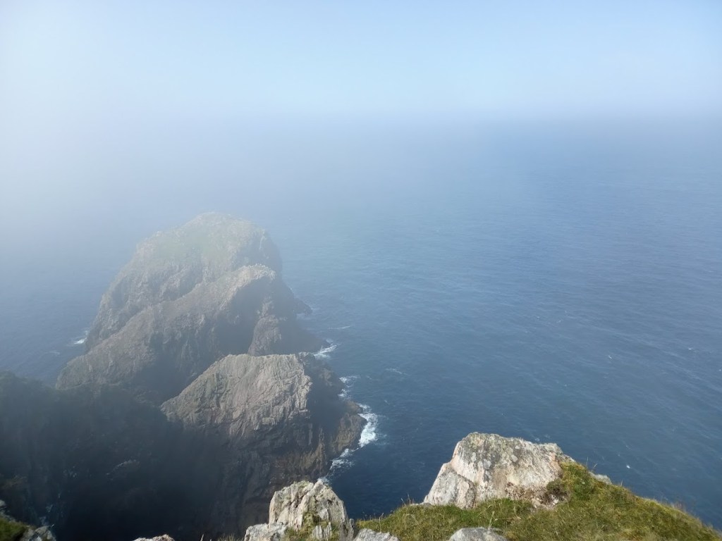 We stood looking out at the North Atlantic, with nothing but waves and rushing air between us and the North Pole. The ground dropped precipitously away from our feet, plunging several hundred feet into surging water that drifted in and out of view between wreaths of mist. There was no sound but the soft roar of the ocean and the eerie calls of seabirds that swooped and dived like small dragons around the mighty cliffs.